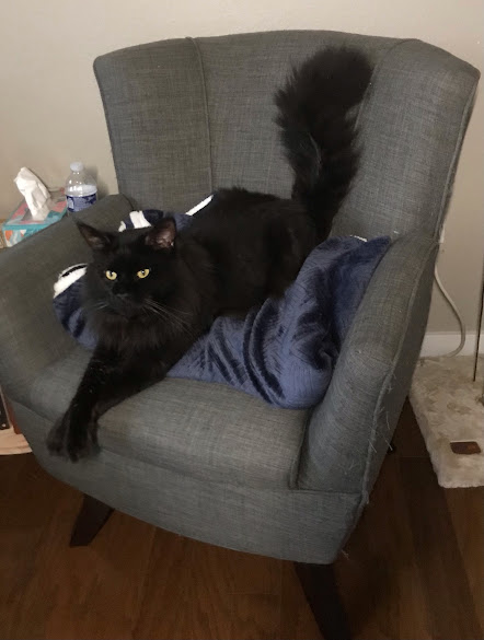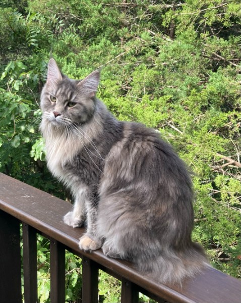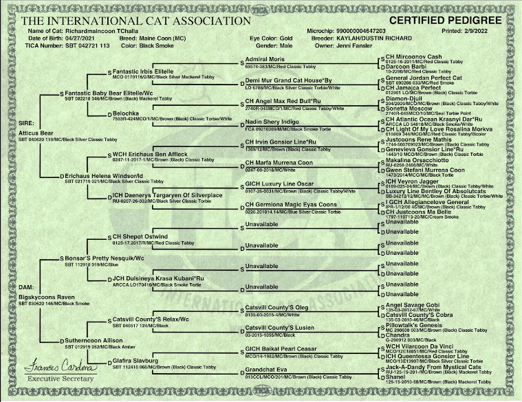 Richardmaincoon T’Challa was born in Springfield, Missouri on April 27, 2021. He is a solid black Maine Coon registered with TICA and has the dignified bearing of a small panther. T’Challa is intensely loyal to his owner and friendly to all other animals. He has been known to be a “paws-on” daddy to his kittens, grooming and snuggling with them as any good daddy would.