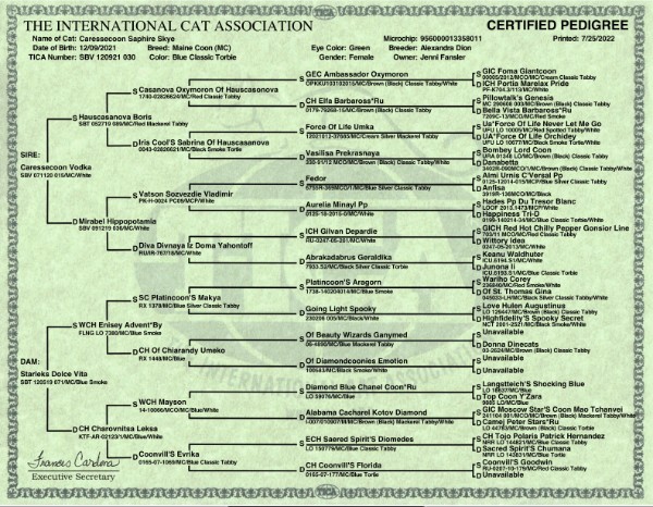 Caressecoon Saphire Skye was born on Dec. 9, 2021 in Cape Girardeau, Missouri. She is a blue torbie Maine Coon registered with TICA, and hails from multiple award-winning breeder Alexandra Dion. Skye’s sweet, unassuming demeanour has won her the nickname, “Sweets.” She has also proven to be a very attentive mother to her kittens. The pairing of T’Challa and Skye produces a variety of coat patterns including red tabby males, dark torbie females, as well as dark tabby or solid black of either sex.
